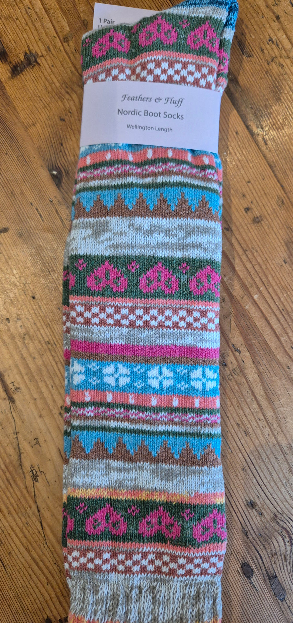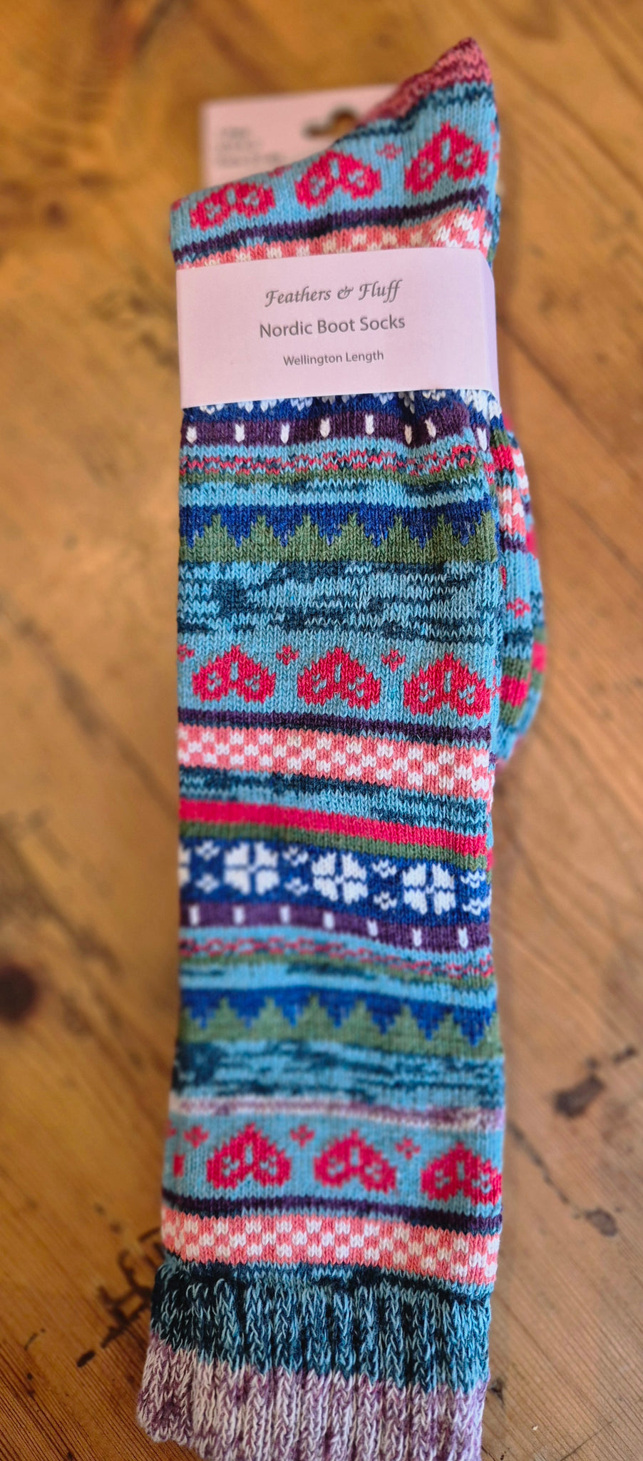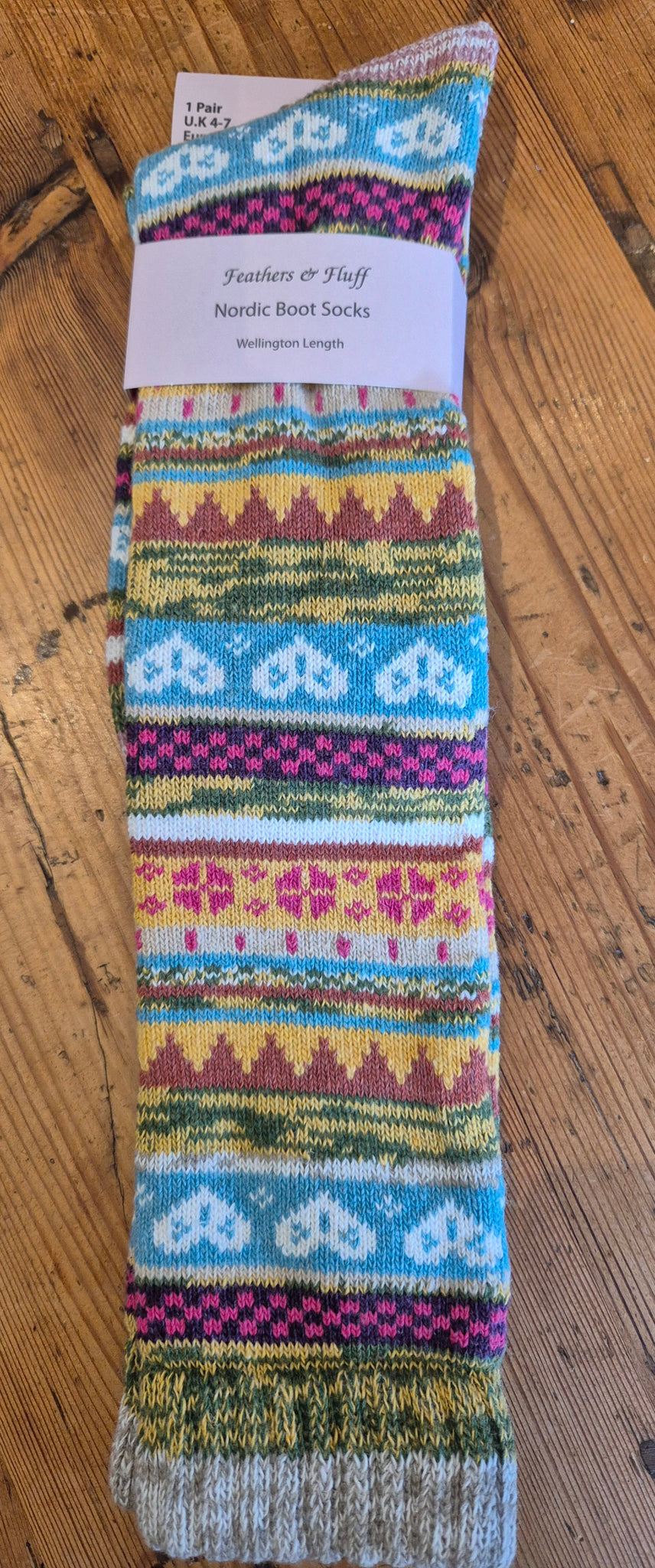 Stay warm and stylish this winter with the Ladies Knee High Nordic Inspired Socks. Perfect for colder weather, these socks are made from a soft and durable wool blend that provides excellent warmth and comfort. The knee-high design ensures full coverage, making them ideal for wearing with boots, leggings, or as part of your cosy winter wardrobe.